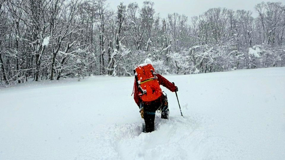 ラッセルは雪山歩行の基本。登山の力を押し上げ、幅を広げる技術です。地味でキツイけど、振り返って自分たちのトレースを見ると感無量。よく頑張りました!